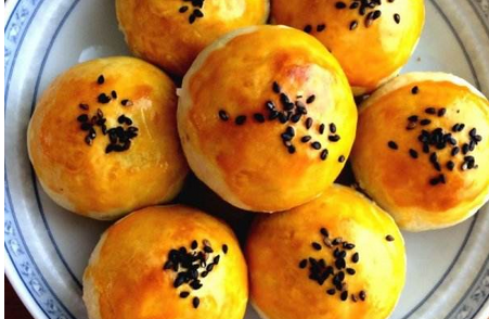 酥饼(Crispy Cakes),系有特制的脂烙酥而得名。脂烙酥用上好的猪油,拌以适量蒸好的面粉,化油时加适量花椒、桂皮,油化后剔出已炸酥的花椒、桂皮,再和面成馅。火烧皮用香油和面,包制好入炉,用文火烘烤而成。其特点是皮酥,瓤有异香而不腻。