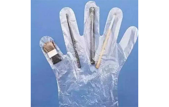 很多人化妆都不能离开化妆刷,所以出门也必须带着,可以将要用的化妆刷放进一次的手套中,五个手指可以放五把刷子,外出基本就够了,刷子放进去后,用小皮筋固定一下,就可以了。