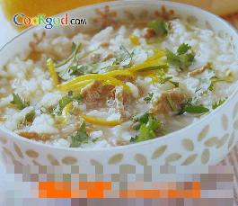 材料白米1杯,嫩牛肉150克,橘皮1片,香菜2棵调味料(1)料酒半茶匙,酱油半大匙,淀粉1茶匙(2)水8杯,盐1茶匙,胡椒粉少许