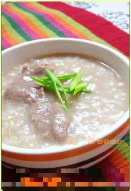 粥,牛肉,蛋清,生粉,糖,盐,蒜苗,白胡椒少许