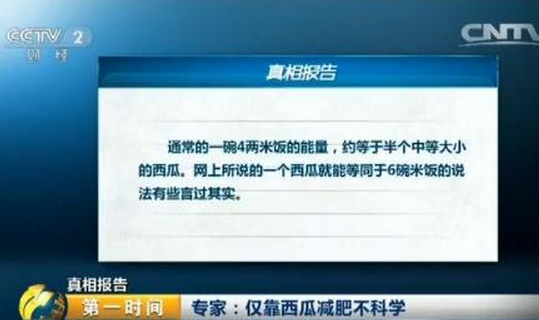 一到夏天,有爱美的女孩干脆拿西瓜来代替正餐,觉得这样能减肥。不过最近网上却流传一种说法,一个西瓜能顶6碗米饭!经过实验计算,100克的西瓜它是26大卡的能量,通常的一碗4两米饭的能量,约等于半个中等大小的西瓜。看来,网上所说的一个西瓜就能等同于6碗米饭的说法有些言过其实。可是,如果要指望靠西瓜减肥,那也是不科学的。专家提醒:西瓜水分多,代谢快,只吃西瓜不仅容易饿,而且各种营养成分基本都不如米饭,并不建议代替主食。