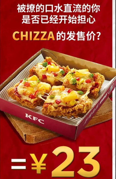 中国KFC也终于推出了CHIZZA!它的上市时间就是2017年6月5日,可以说Chizza说Double Down的继承者啊,Double Down的面包也被炸鸡替代了。Chizza上面将会有菠萝、辣椒和意式香肠。