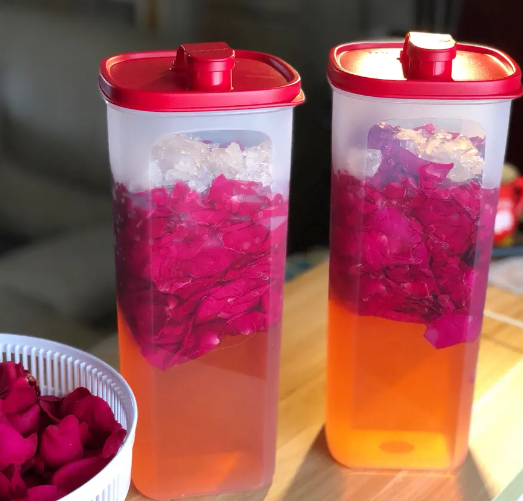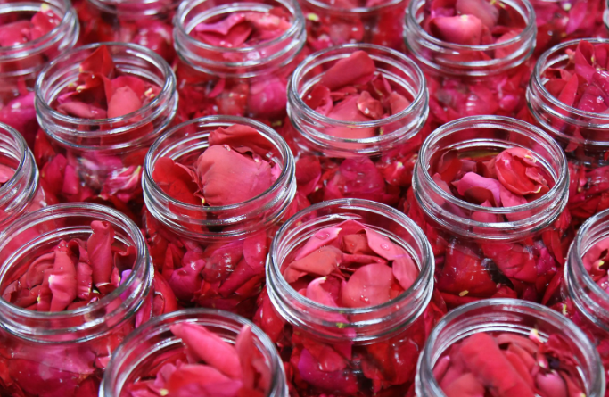 1、将密封瓶洗净擦干,确保无油、无水、干净。将新鲜的食用玫瑰花瓣直接放入密封瓶中。
