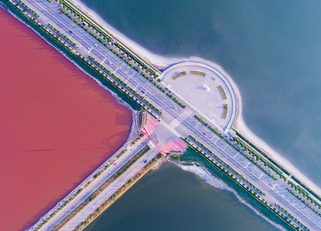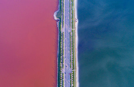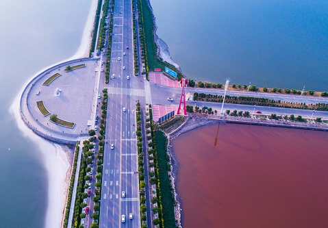 秋分将要到来,气温不断下降,位于山西运城市内的盐湖也呈现出不同的色彩,跨湖大道两侧的盐湖水面一侧呈绿色,一侧呈玫瑰红,惊艳了无数网友。