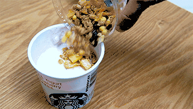 吃法get!问:正确吃星巴克谷兰诺拉酸奶杯总共分几步?只需三步!拆开——wow~诱人的酸奶正式亮相!