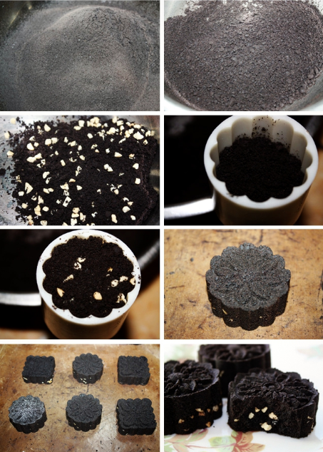 7、用手或者其他工具将糕粉压紧后再倒转模具,在垫好油布的烤盘上压出月饼。注意,一定要将糕粉压紧后再倒转模具,不然糕粉会一下子散落在油布上。