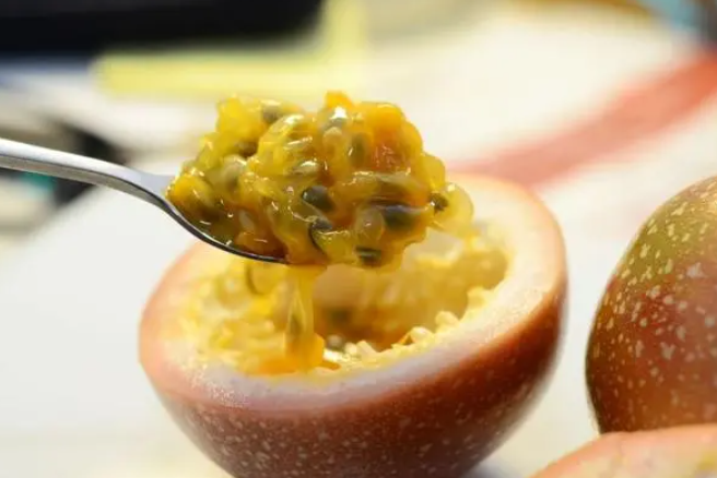 6.直接鲜食:取成熟的百香果,洗净切开,直接食其果汁;也可放些糖,用汤匙搅拌后食用。种子香脆可食,营养丰富似葵瓜子。