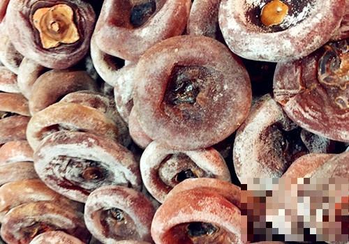 柿饼的制作工艺考究,首先选充分成熟,肉质坚硬,果形端正少核或者五核的柿子品种,去皮后待用。选光照充足,空气流通,清洁卫生的地方,搭架后将去皮的柿子果顶向上,单层排在箔上曝晒,晚间防露水,雨天防雨水。期间经过几次翻动,待柿饼外硬内软,回软后没有发汗现象后就可进行上霜。将两饼顶部相合,萼蒂部向外,在缸中放一层干柿皮放一层柿饼,反复叠放至将满缸,然后封缸,放在阴凉处生霜。柿饼上霜与环境温度有关,温度越低,上霜越好,所以要将缸放在阴凉处。