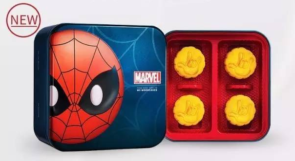 超级英雄与美心奶黄月饼结盟,Spider-Man(蜘蛛侠)大头造型,配合漫画主题的深蓝色礼盒,粉丝们岂有不入手之理。