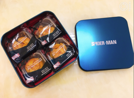 漫威合作款,蜘蛛侠奶黄月饼,一盒4个,每个约45克。