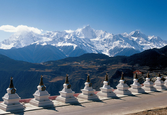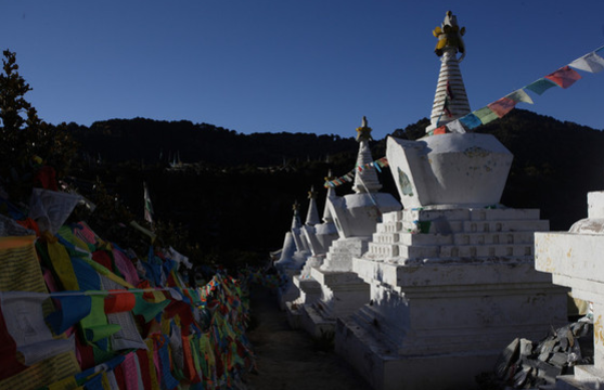 2、雾浓顶观景台,从中甸方向进入德钦的214公路上,离德钦县城约15公里,建有13座白塔,地势开阔,颇为壮观。
