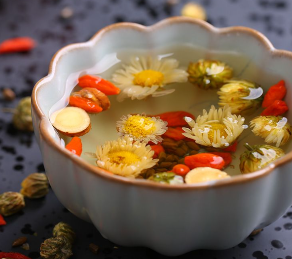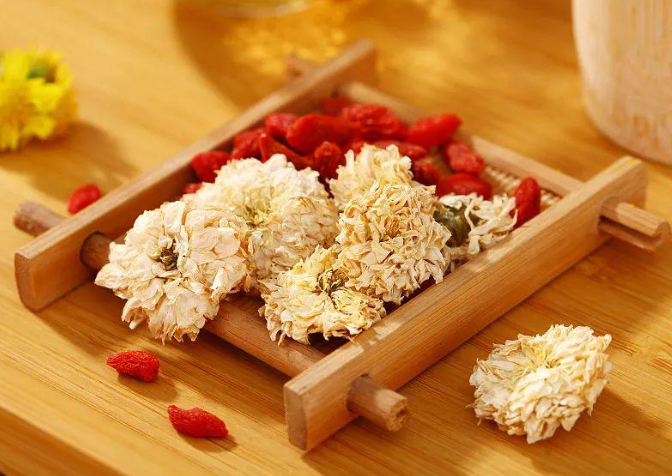 枸杞具有很好的滋阴补肾作用。滋补肝肾,清肝明目。菊花能清风清热,安肝潜阳,明目。能有效滋补肝肾阴,缓解肝肾阴虚引起的五心热、眩晕、耳鸣、精力衰退、腰膝酸痛等一系列病症。目前,临床药理学研究表明,枸杞中含有丰富的枸杞黄素、氨基酸、微量元素和矿物质,具有良好的美容、美白、抗衰老和抗肿瘤作用。菊花还富含矿物质和微量元素。一起喝代茶是一种很好的美容产品。