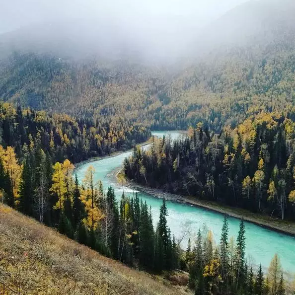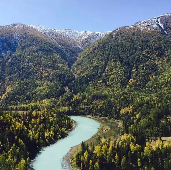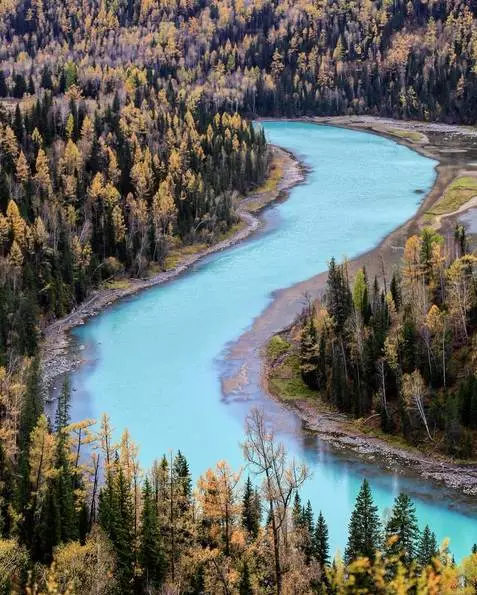 美丽静谧的月亮湾会随喀纳斯湖水变化而变化,是嵌在喀纳斯河上的一颗明珠,也像一条长长的蓝色纽带。月亮湾迂回蜿蜒于河谷间,水面平波如镜,在上下河湾内发育两个酷似脚印的小沙滩,很是奇特,被当地人称为“神仙脚印”。