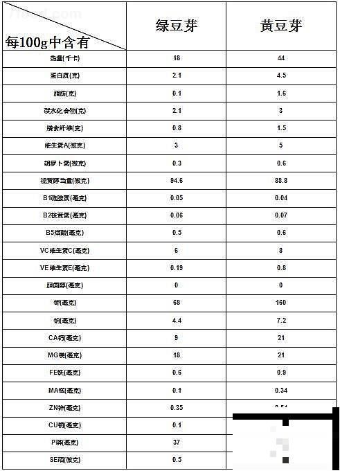 那么,绿豆芽与黄豆芽除了品种不同,营养上还有什么异同呢?下面我们来看一张表格:
