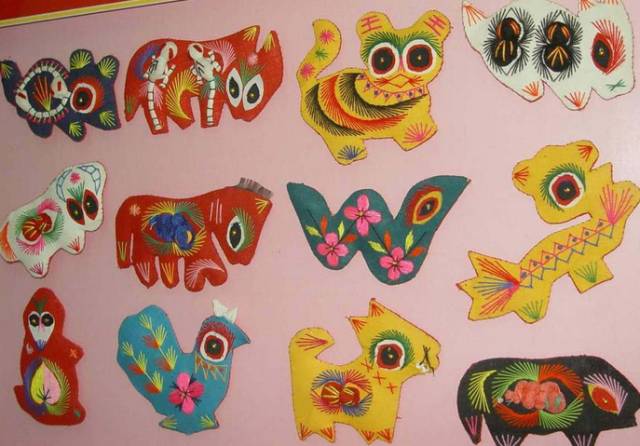 可以结合十二生肖文化,先让孩子们欣赏刺绣成品图,然后装饰可爱的十二生肖。