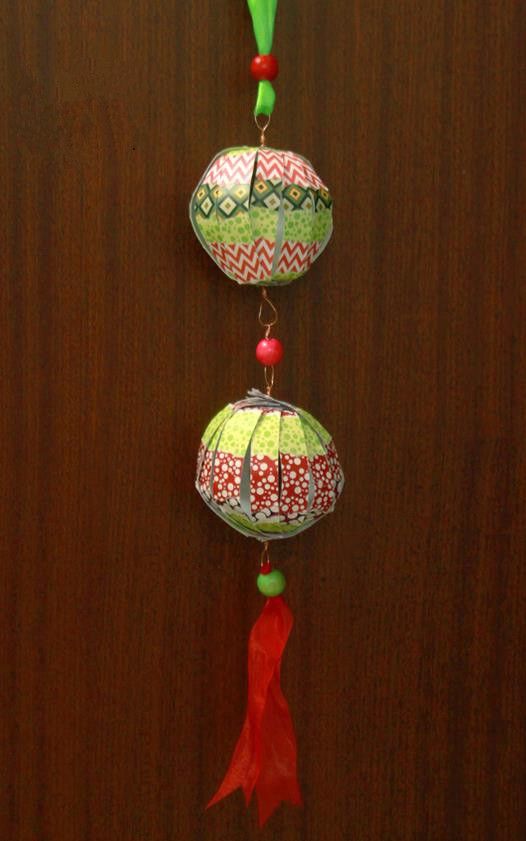 第4步:将两个灯笼连在一起就是一个漂亮的灯笼装饰啦,在下面再加上丝带就更漂亮了,也可以串一些漂亮的串珠在中间哦~