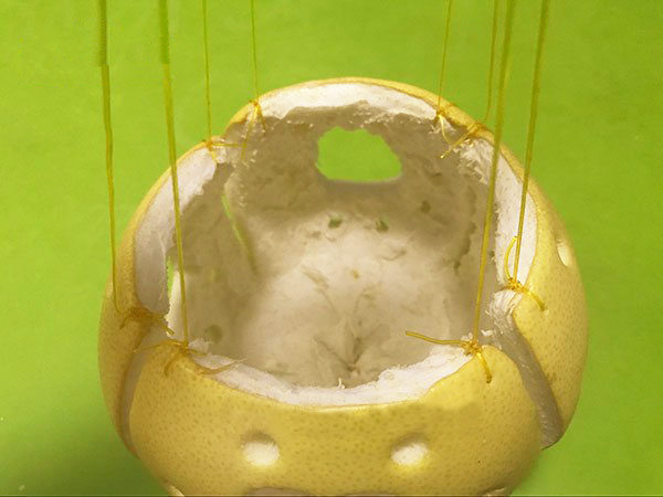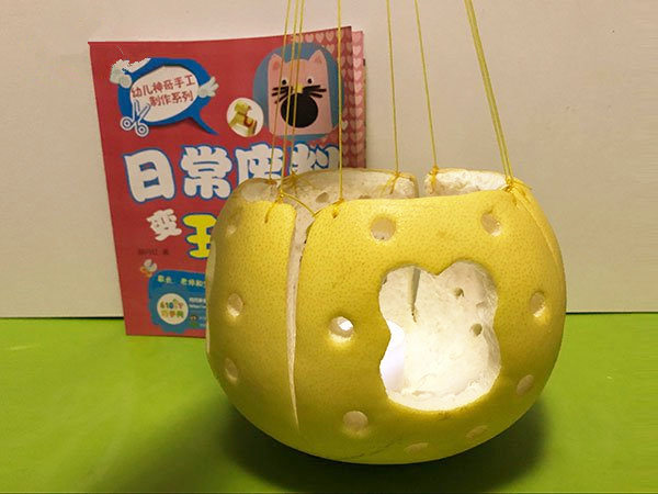 利用小刀,模具在剥好的柚子皮四面上刻画出一些小孔或者兔子图案,让灯笼更加贴切中秋节日气氛,之后在柚子皮上方边缘四周都固定上一些绳子或者丝带,集中起来就可以挂在自己喜欢的地方了,最后在里面点一根蜡烛或者装一个小灯泡即可。
