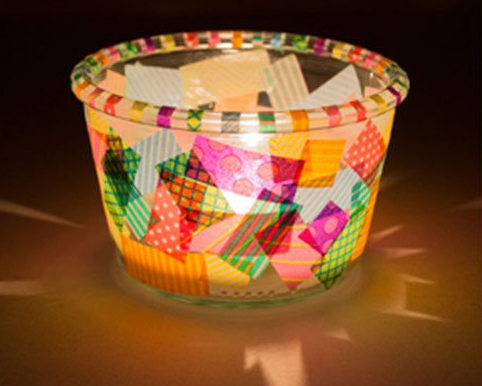 彩色胶带在粘贴的时候可以稍稍重叠,胶带粘贴的方向不要全部一致,直到差不多将杯子或者碗盖住,之后在里面点一个蜡烛或者放一个小灯就完成了!