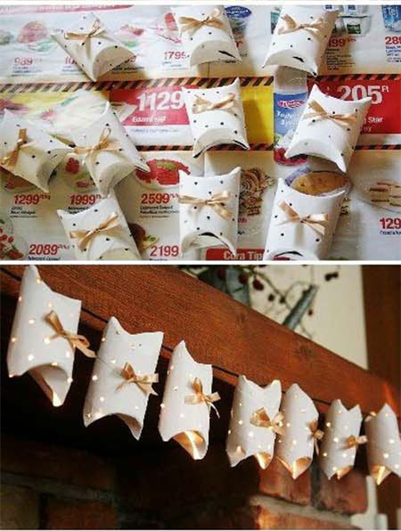在纸筒表面进行装饰,用丝带固定一个蝴蝶结等等,之后将小灯泡塞在纸筒里面,连成串,固定在合适的位置,插上电就完成啦~