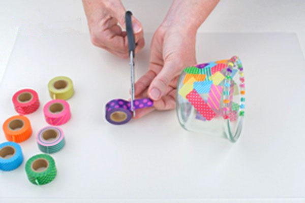 首先准备一个废弃的玻璃瓶或者透明的一次性杯子,碗都可以哦!准备一些彩色的胶带,将它们剪成一小截粘贴固定在透明杯子或者塑料碗上