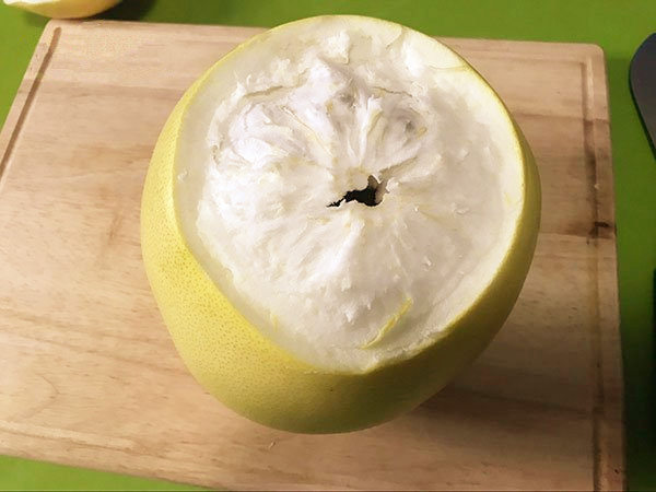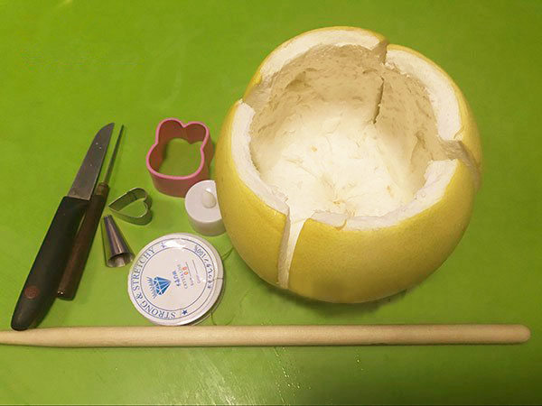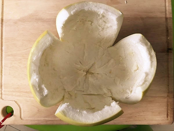 准备好所需材料,将一个完整的柚子皮切四刀,不要剥坏,取出其中的果肉部分,果皮备用,