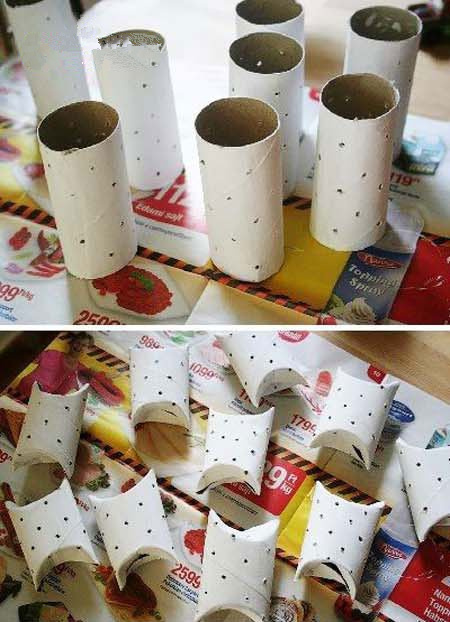 首先多准备一些废弃的卷纸筒,将它们的表面钻上孔,孔可以钻的不规则一点,再将纸筒上下两端向内弯折,形成一个菱形的盒子形状,如图