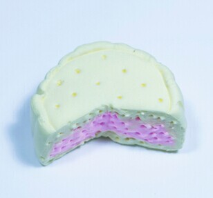 第八步:用切刀切下一块扇形的月饼,月饼的草莓馅儿就显露来了。