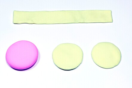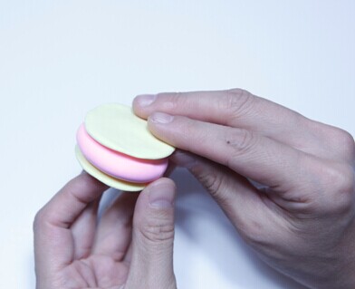 第三步:将粉色圆片夹在两个浅黄色圆片中心。