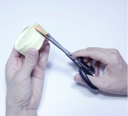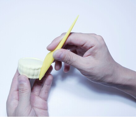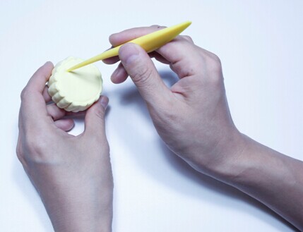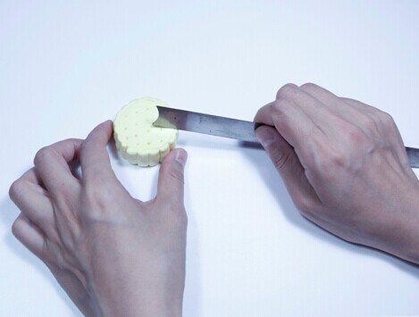 第九步:用戳点东西在月饼切开的有些戳挑,制作粗糙肌理作用。