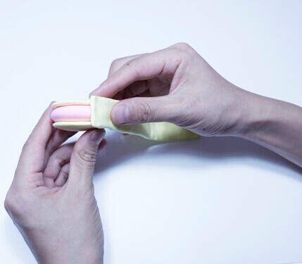 第二步:粉色圆球、两个浅黄色小圆球压成圆片,巨细一样。浅黄色大圆球压生长条形。如图
