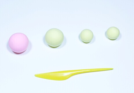 第一步:用粉色粘土制作一个圆球,作为月饼的草莓馅儿。用浅黄色粘土制作一个大圆球和两个小圆球,作为月饼的面儿。