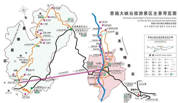 A线:游客中心→乘换乘车→云龙地缝景区→客运索道上行→七星寨景区→小楼门→绝壁长廊→中楼门→峡谷轩酒店→一炷香→大楼门→观光电梯→峡谷春酒店→游客返程中心→乘换乘车→游客中心→乘换乘车→观看山水实景音乐剧《龙船调》(20:10)→游客中心→入住酒店(最佳游览线路)。