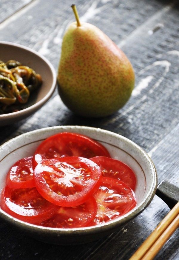 小时候妈妈用白砂糖做凉拌西红柿的时候,要放冰箱腌制一会,吃的时候还会拿勺子去压西红柿,为了让它多点汁水,最期待的就是那碗底的汤水,甜中一点儿微酸。