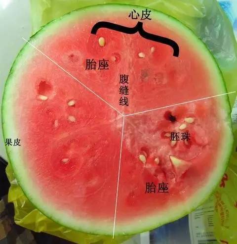 西瓜是葫芦科植物,葫芦科植物有个特点,就是一般具有3个心皮(当然在环境影响下数目可能会发生变化),并且这3个心皮各自并不完全封闭,而是相互联合起来。这样,胚珠就存在在了3个心皮彼此的结合部位,这就是所谓的“侧膜胎座”。随着子房的发育,西瓜的一部分果皮和大部分胎座逐渐膨大起来,产生了 多汁疏松的细胞组织 ,这就是我们吃到的 “西瓜瓤” 了。