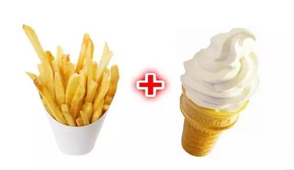 薯条,刚出锅,热热的,外表脆脆,还有一点明显的细盐在外面,里面是软的,最好是拿硬而热的薯条刮甜筒冰淇淋吃。一截一截咬下去,每一口都吃到盐,脆热的外皮,烫嘴的柔嫩土豆肉,还有又甜又凉又奶的冰淇淋。这样就可以冷热甜咸硬软一口吃到。