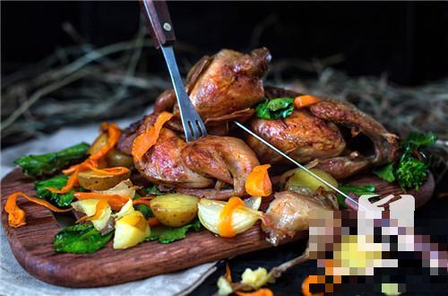 就是将宰杀洗净的乳鸽腌渍入味、烫皮、挂脆皮水,风干,放入烤炉中烤熟后,再经过油炸上色制成。烤乳鸽表皮光滑,色泽红亮。乳鸽的前期加工及腌渍和生炸法基本一样。所不同的是在腌制时要把乳鸽从胸骨顺刀劈开,腌好的乳鸽展开成“琵琶”状(所以烤乳鸽又叫“琵琶鸽”),用专用的乳鸽叉撑开。将乳鸽挂脆皮水后风干,用锡纸包裹翅尖,挂入烤炉中小火焖烤分钟至九成熟,待表皮呈淡黄色,然后再经过油炸上色即可。这种方法较前两种方法更容易掌握,效果也相对好一些。有厨师朋友问:为什么不能像北京烤鸭一样直接就把颜色烤上去呢?其实是可以的,只不过乳鸽的组织结构跟鸭子有差异,不能像鸭子一样去翅充气,又没有鸭子的脂肪肥厚,劈开乳鸽直接烤制上色,会造成乳鸽表面肉质焦黄,翅膀和腿下面的皮肤上色不均匀,影响烤乳鸽的视觉效果和口感,不如先烤后炸的效果好。