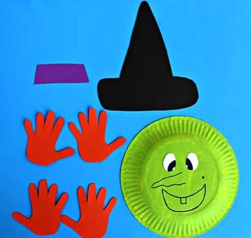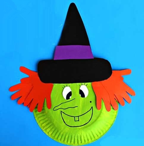 第二步:讲盘子涂成浅绿色的,然后用黑色卡纸剪出一个尖帽子的形状,按照帽檐上方的宽度剪出一个别的颜色的长方形,用白色卡纸剪出两个椭圆贴在圆盘上,并用黑笔在圆盘上添加巫婆的眼珠,鼻子和嘴巴等。