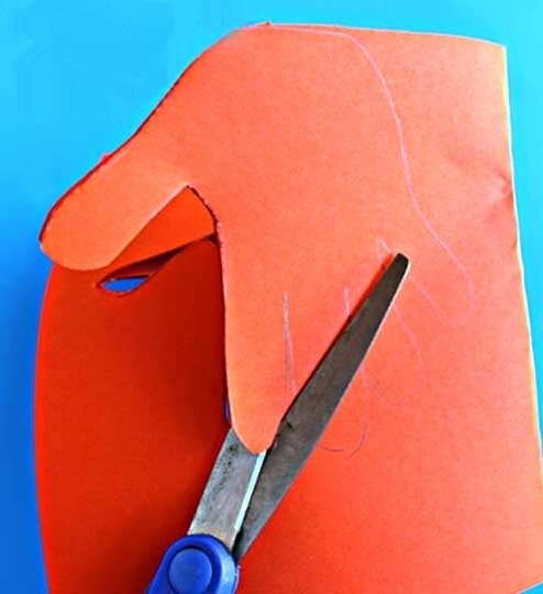 第一步:选一张橘色卡纸,然后将手放在上面,描出手的外形,并将其剪下来,需要四个,剪好后放在一边备用