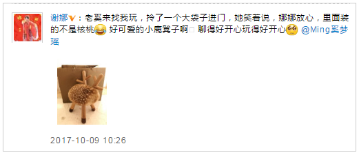 10月9日,谢娜微博微博晒出与奚梦瑶合影,配文:“老奚来找我玩,拎了一个大袋子进门,她笑着说,娜娜放心,里面装的不是核桃。好可爱的小鹿凳子啊!聊得好开心玩得好开心!”配图中还有奚梦瑶送谢娜的小鹿凳子。