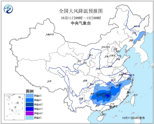 预计11日08时至13日08时,江南大部、华南北部、贵州中东部等地有6~8℃降温,局地降温可达10~12℃,上述部分地区有4~5级风。东海西南部海域、台湾海峡、南海北部等海域将有6~8级、阵风9~10级的东北风。中央气象台11日06时继续发布大风降温预报(见图1)。