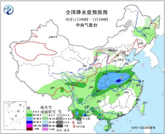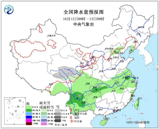 图2 全国降水量预报图(10月11日08时-12日08时)