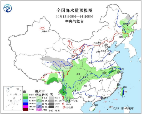 图4 全国降水量预报图(10月13日08时-14日08时)
