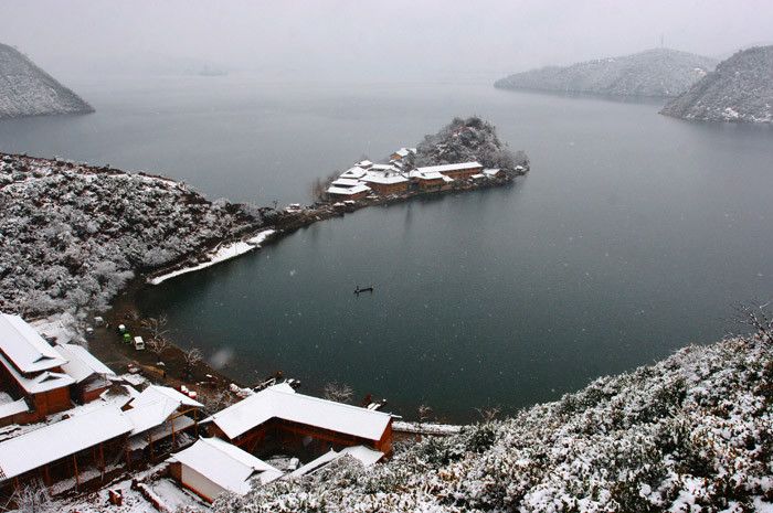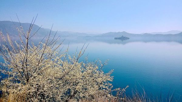 周围的桃树、梨树都已经开花,争妍斗艳;湛蓝的湖水,净如明镜,青松绿树,连峰映湖中,全然一幅世外桃源的景象。