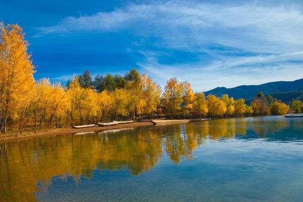 金黄色的秋叶,点缀着周围的山峦,湖水碧蓝,波光闪烁,彩霞飞渡,高空雁鸣,呈现出“落霞与孤鹜齐飞,秋水共长天一色”的景象。