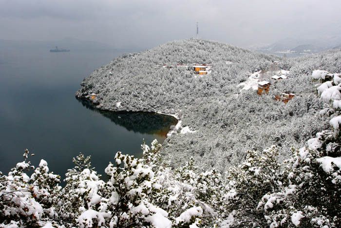 湖水碧绿,波光粼粼,雨后烟雾缭绕,周围黛色丛林中,间杂着盛开的红白杜鹃花,景色宜人,凉爽无比,是绝佳的避暑胜地。