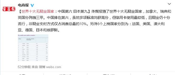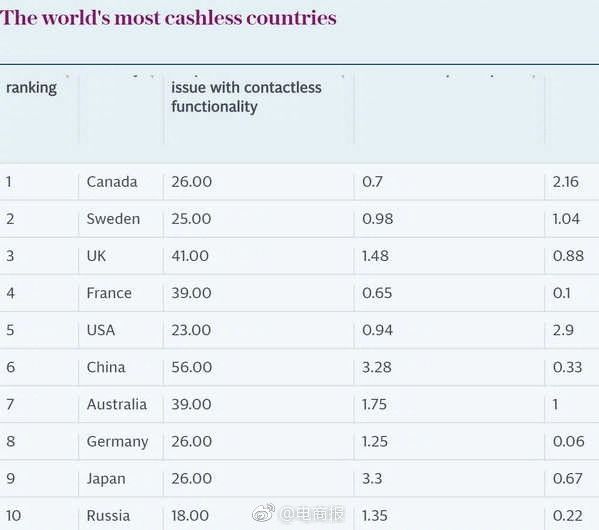 随着移动支付普及与发展,想必有不少朋友出门时候都很少带现金,那么世界十大无现金国家排名中,中国会排到什么位置呢?据外媒报道称,世界十大无现金国家排名前三分别是加拿大、瑞典和英国,而中国排名则是位列第六,其它上榜国家是法国、美国、澳大利亚、德国、日本和俄罗斯。