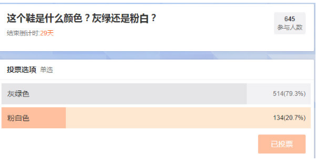 截止发稿时,从全民话题 微博做的投票结果显示,79.3%的人,看到的是灰绿色,20.7%的人,看到的是粉白色。