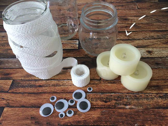 准备感觉的玻璃瓶,蜡烛,绷带或者纸带,活动眼珠等