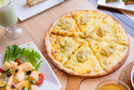 榴莲多多披萨每个披萨上都有三大块榴莲肉,用的金枕榴莲。香味很浓,虽然铁盘的饼边永远那么硬。铁盘在底部会刷一层用果肉调制出来的果酱。