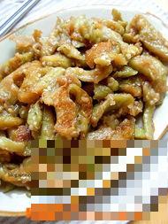 6.等面煎成金黄色,略有一点糊也可以,这样比较香,就把茄子翻过来煎。这时尽可以把茄子挑碎再翻,咱又不是烙饼哈。等这一面也达到另一面的成熟度,再翻炒几下,让茄子形成单独的一块块的,就可以出锅啦